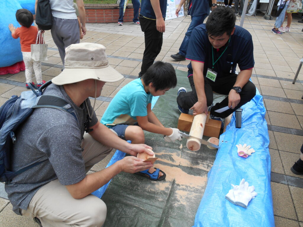 当組合の体験ブースでは、間伐材の丸太切りやスギ材やヒノキ材を使ったコースターづくり体験のほか、「森林のサイクル」パネルを掲示して森林に対する理解を深めてもらいました。
